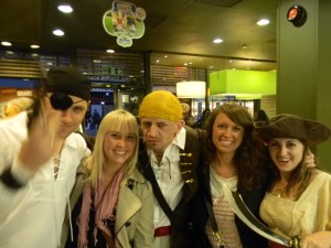 From there we decided to go the American way for dinner…aka McDonald’s. (Might I say that they have classier McDonald’s here than in the States…hint hint America!) When we walked into MickyDs we met some pirates…yes I just said pirates! When I asked them why they were dressed like pirates and all the main guy said was, “So that blonde fair maidens like you ask to take pictures with us!” Which yes, I did ask to take a picture with them, but how could I resist? They we London pirates! With the accents and all! I could not help but to pull my camera out and ask, and they were happy to oblige. 🙂