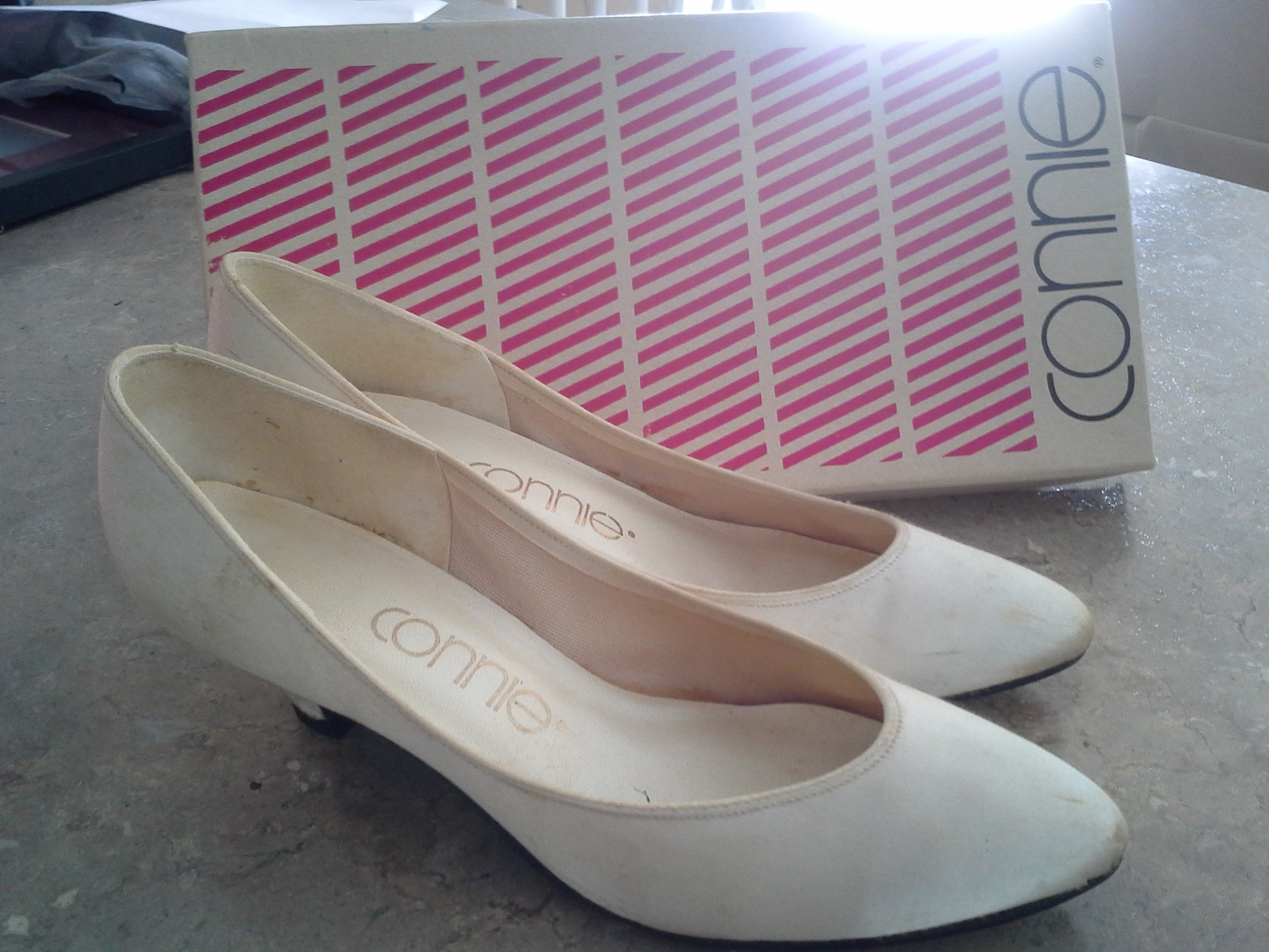 Luckily for me, my mom and I wear the same size shoe…and she just happened to have saved her cute little kitten heel wedding pumps from her special day.