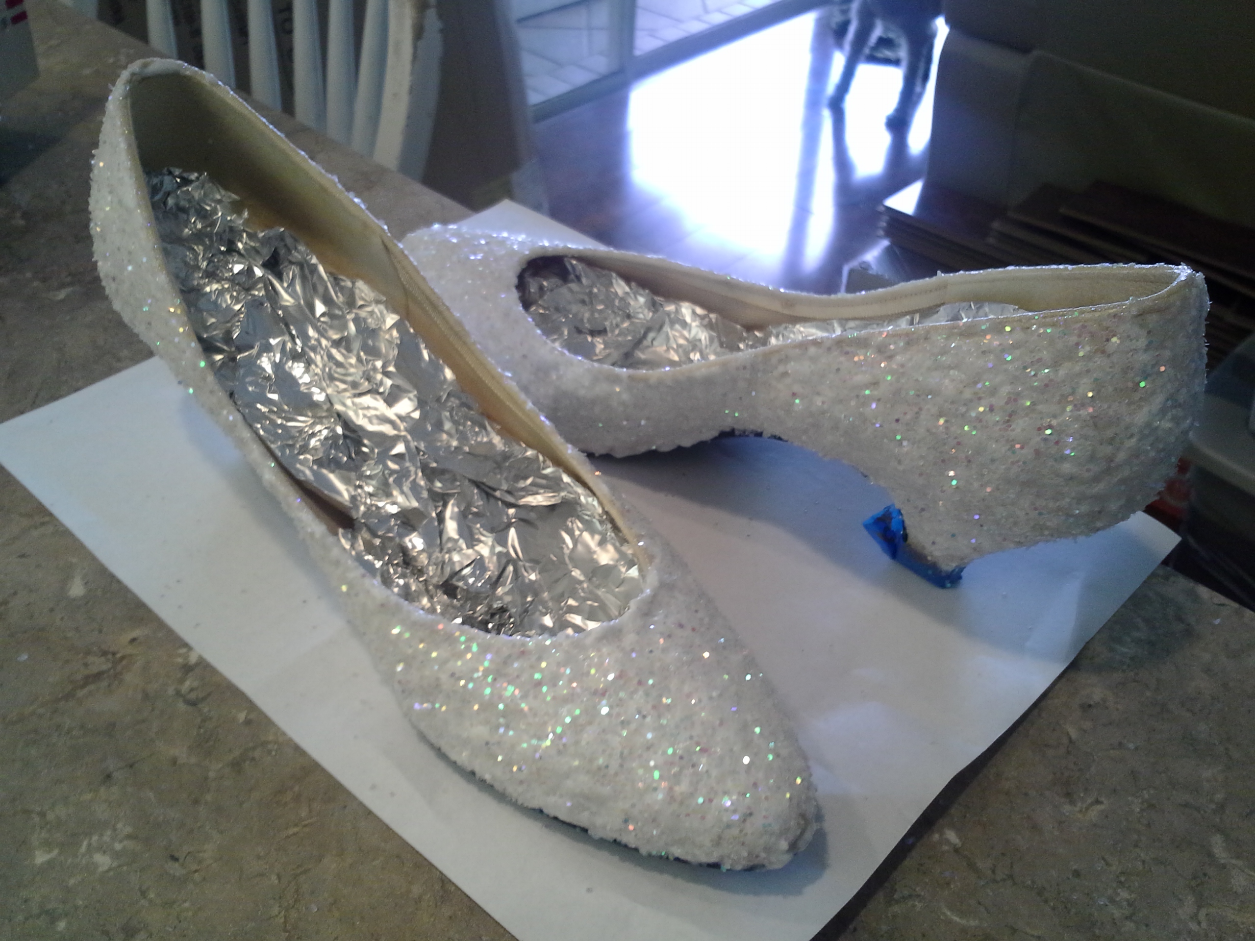 First thing you want to do is prep your shoes. Cover the heel tips with tape and stick some foil inside of them to avoid getting the Mod Podge all on the inside.