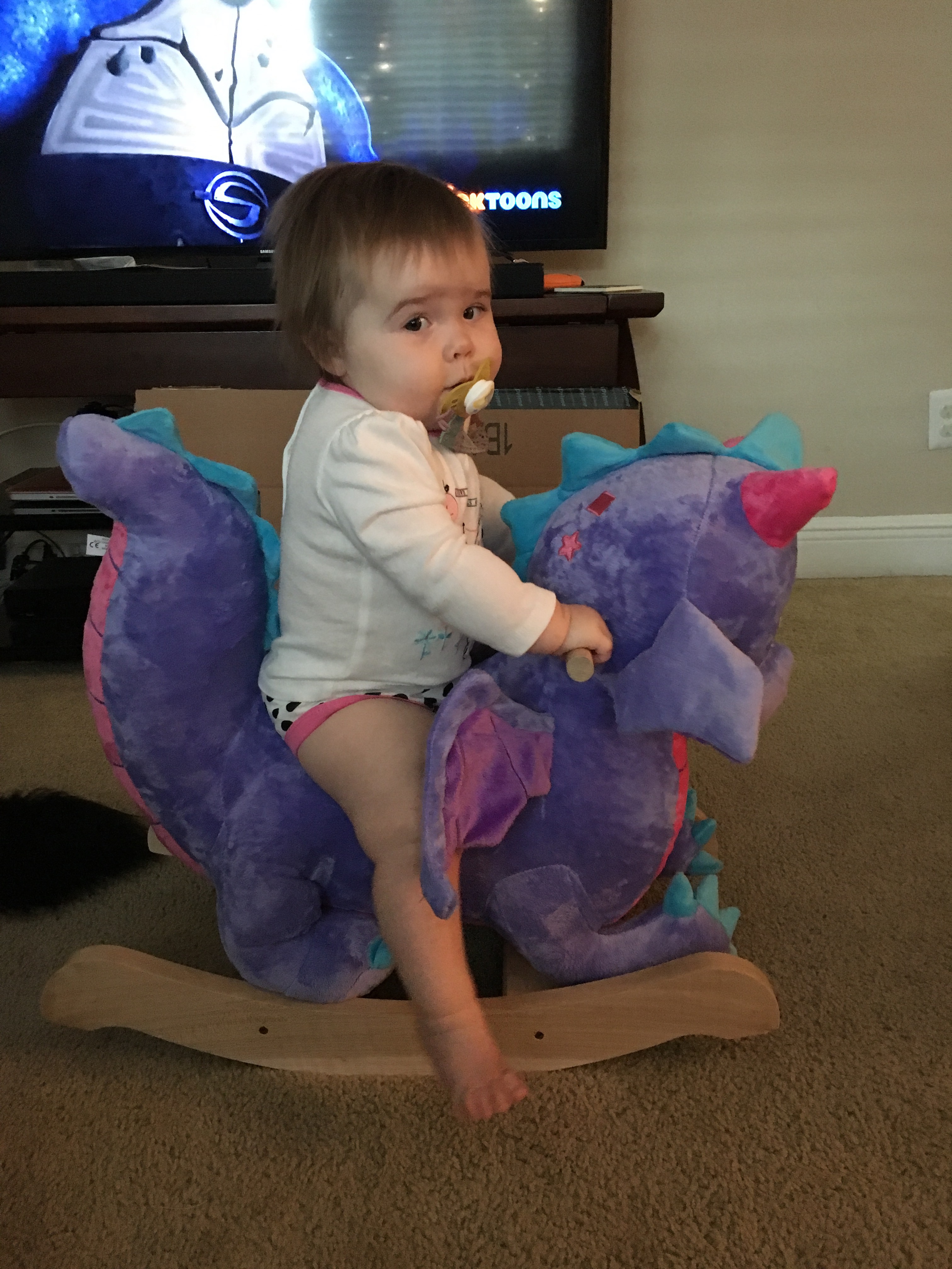 Noises and sounds: Aurora is still very opinionated and enjoys hearing herself talk. No real words…but will try to copy sound you say or sing. It is pretty adorable!