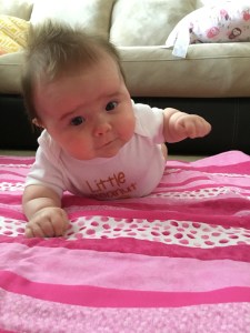 Fun things!: Our little peanut’s personality is showing more and more. With all the rolling, she has become curious about things and gets into some mischief. When we tell her “no” she thinks it’s funny. Cheeky little trouble maker.